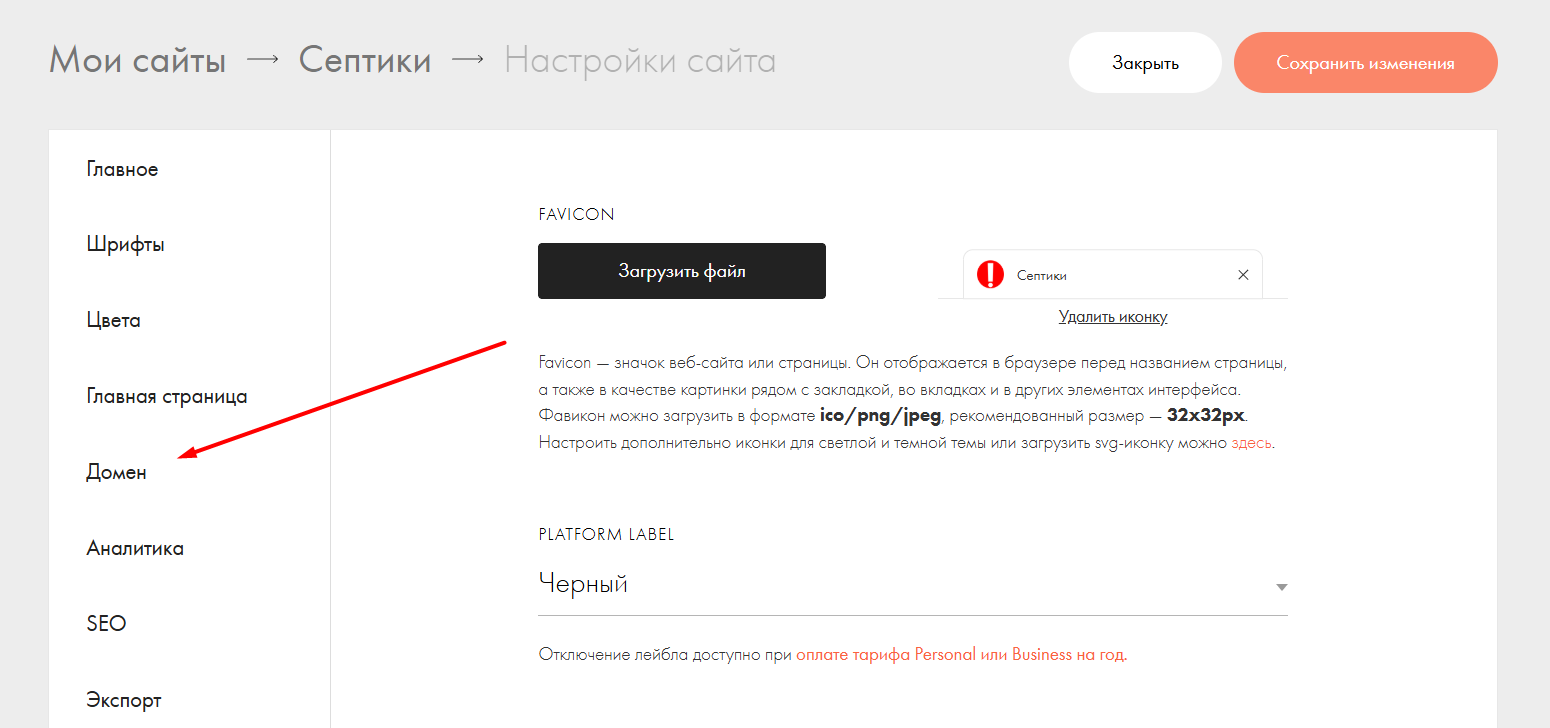 - Вернитесь в Site Settings → Домен на Tilda.
