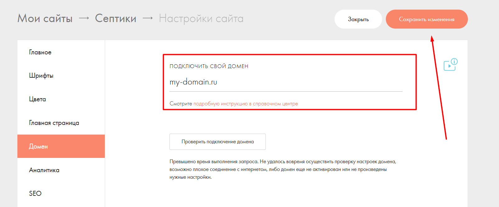 - В поле Custom Domain (Свой домен) введите ваш адрес без http:// и www — например: